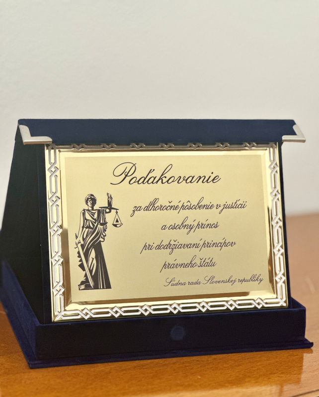 Sudcovia a sudkyne ukončujúci svoje pôsobenie vo funkcii si prevzali z rúk prezidenta Slovenskej republiky ďakovný dekrét. Predsedníčka Súdnej rady Slovenskej republiky im odovzdala ďakovnú plaketu súdnej rady.